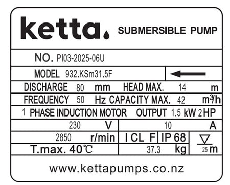 Ketta DrainKing KSM31.5 submersible pump 80 mm (3 inch) with optional float switch 230v 1.5 kW (2 hp)