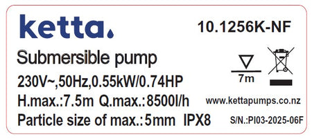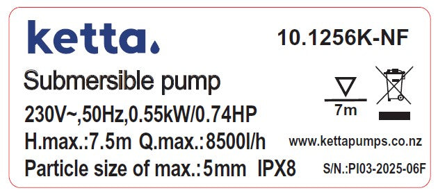 Ketta SS550-B stainless steel submersible pump (no float switch) with hose kit 550 watt 230v 142 lpm 7.5 m head